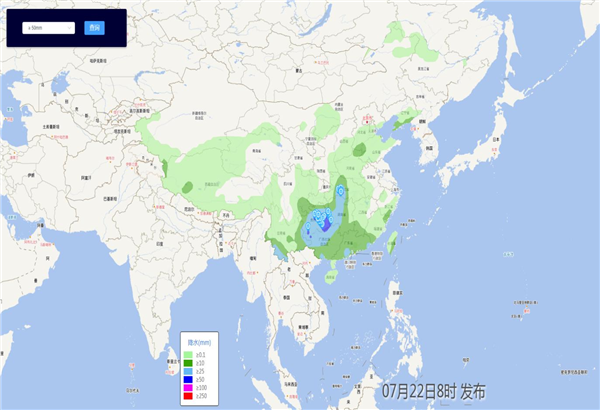 中央氣象臺(tái)7月22日10時(shí)發(fā)布暴雨藍(lán)色預(yù)警和臺(tái)風(fēng)藍(lán)色預(yù)警,“韋帕”風(fēng)雨影響華南及南部海域,西南華南江南部分地區(qū)有強(qiáng)降雨。經(jīng)研判,7月22日,100毫米以上降雨范圍無(wú)受影響尾礦庫(kù)。50毫米~100毫米降雨范圍主要分布在貴州、湖北、湖南3省,共有48座尾礦庫(kù)受降雨影響。