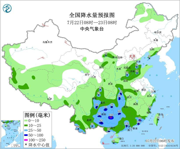 7月22日8時(shí)至23日8時(shí),華南、江南西部、西南地區(qū)東部和南部、江漢西部、黃淮北部等地的部分地區(qū)有中到大雨,其中,湖北西部、湖南中西部、四川盆地南部、貴州、廣西南部和北部、廣東中南部等地的局部地區(qū)有暴雨或大暴雨(100~140毫米)。新疆東部和南疆盆地有4~6級(jí)風(fēng)。